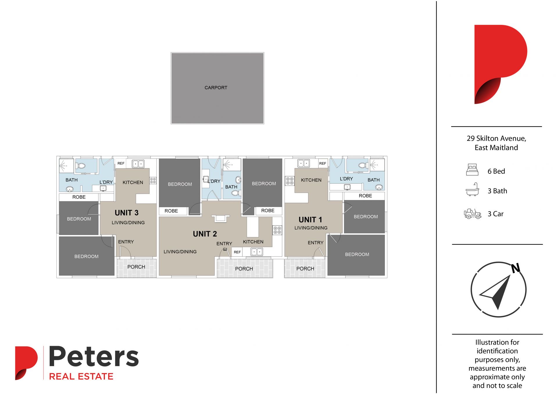 - Large 3-bay carport allocating 1 space per unit