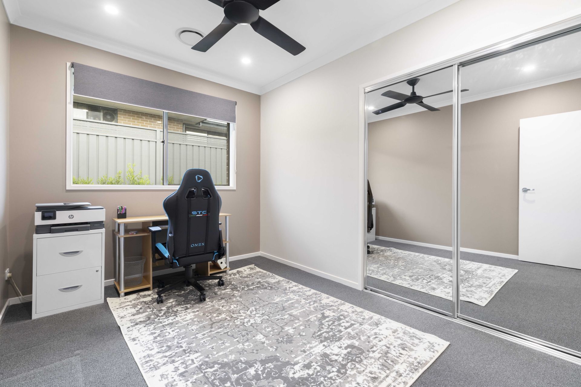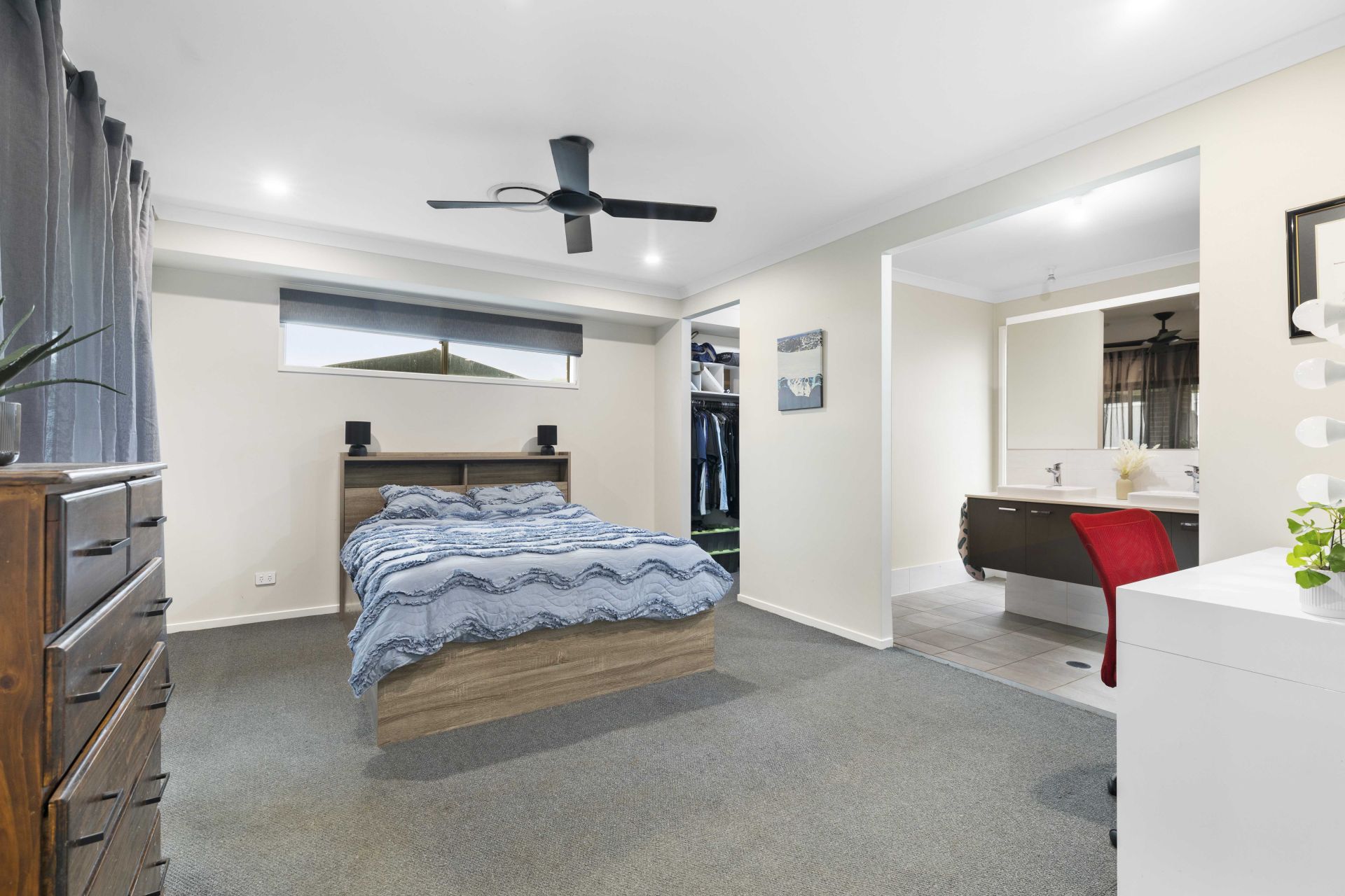 Expertly designed for both comfort and practicality, the home features a master retreat complete with a sumptuous ensuite including double wall hung vanity with stone benchtops and large walk-in robe. The additional three bedrooms include built-in robes, offering ample space for family and guests. A dedicated home theatre room at the front of the house provides a cozy retreat for movie nights, while ducted air conditioning and high ceilings ensure year-round comfort.