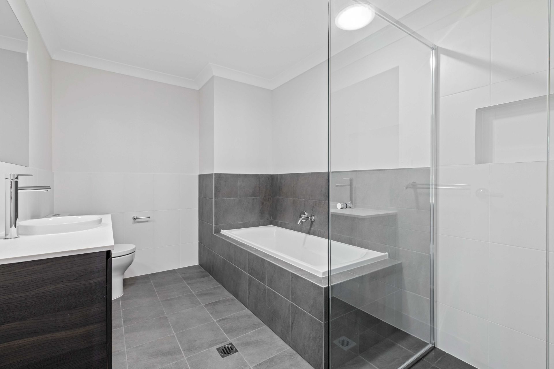 The modern bathroom offers sophistication and a style rarely seen in a duplex unit.