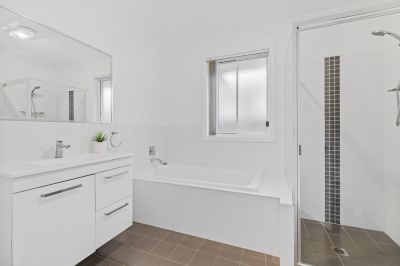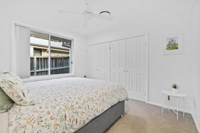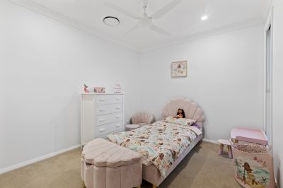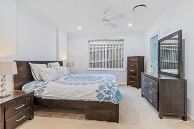 The luxurious master suite offers a private sanctuary, complete with a walk-in robe and an expansive ensuite featuring a sleek wall-mounted vanity and oversized shower. Three further bedrooms are all generously sized with built-in robes and ceiling fans, ensuring comfort and flexibility for growing families.