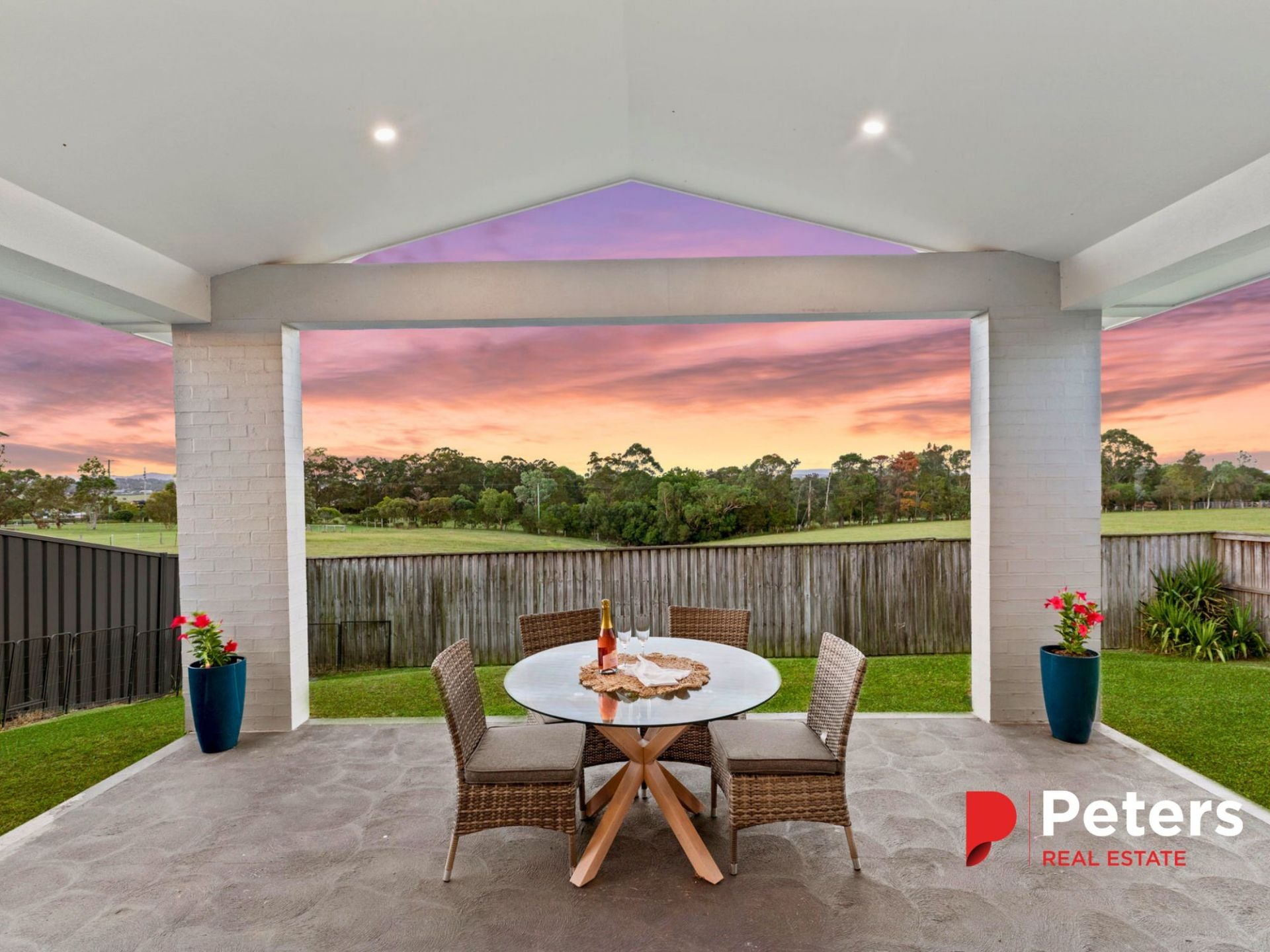 Outdoors, a large covered alfresco captures the homes elevated position, offering a tranquil setting to entertain while taking in uninterrupted rural vistas.